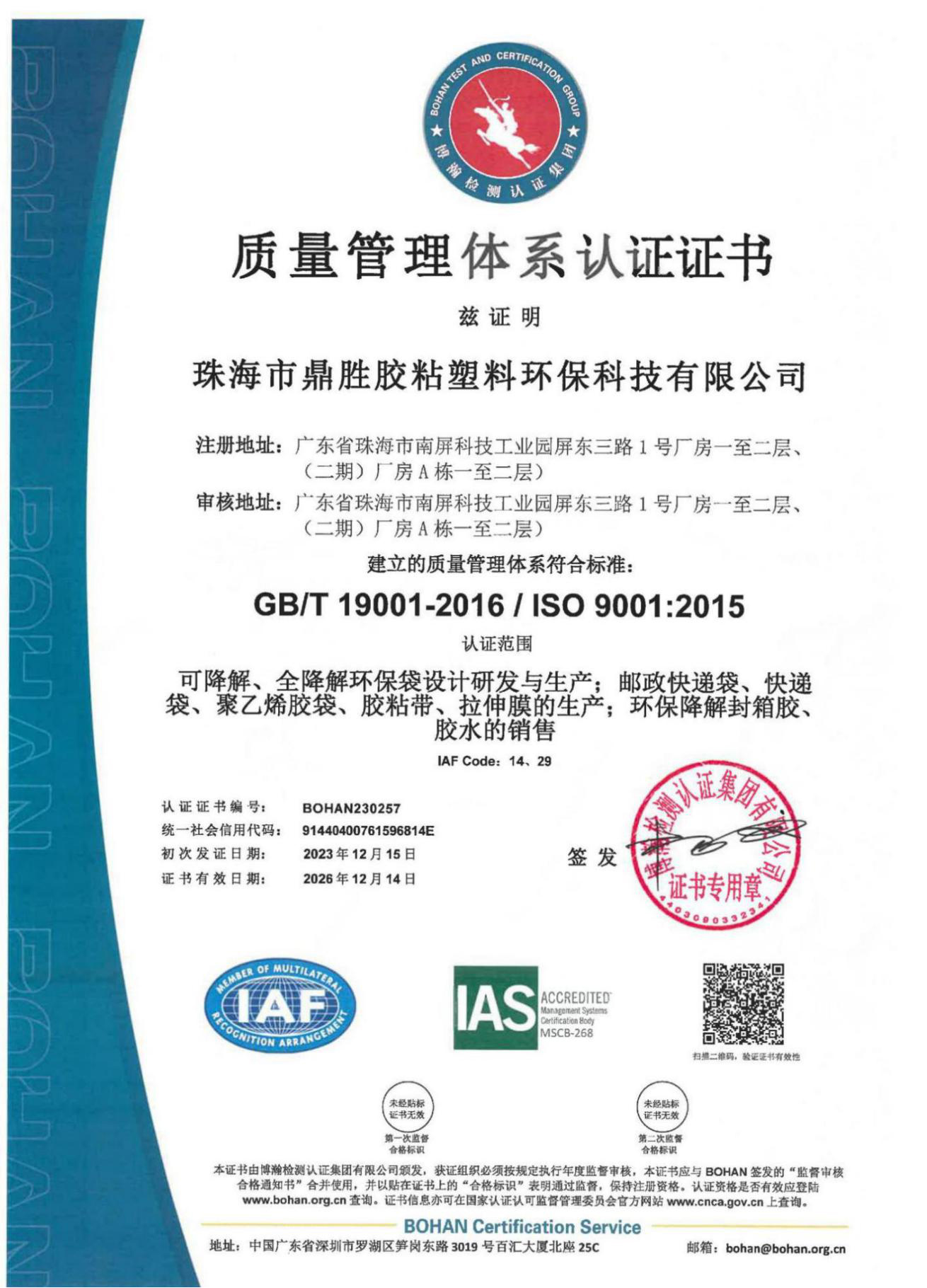 通過質量管理體系認證證書